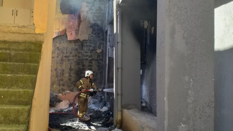 İtfaiye ekiplerinin müdahalesiyle söndürülen yangın nedeniyle binanın dış cephesinde hasar oluştu