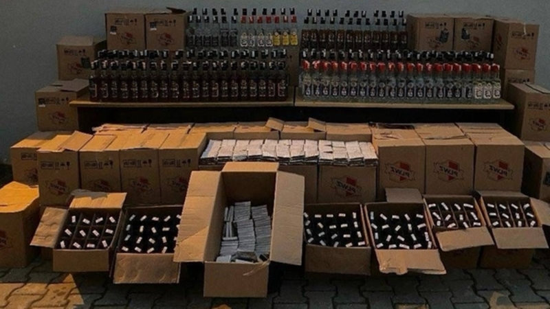 İş yeri ve deposunda yapılan aramada 618 litre kaçak içki ve 5 bin 600 makaron (filtreli sigara kağıdı) ele geçirildi.