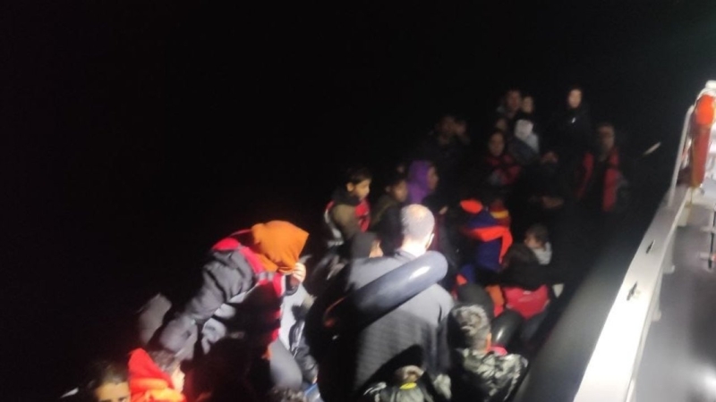 Görevlendirilen Sahil Güvenlik botları “KB-111” ve “KB-4510” tarafından durdurulan lastik botlardaki 79 düzensiz göçmen yakalanarak karaya çıkarıldı.