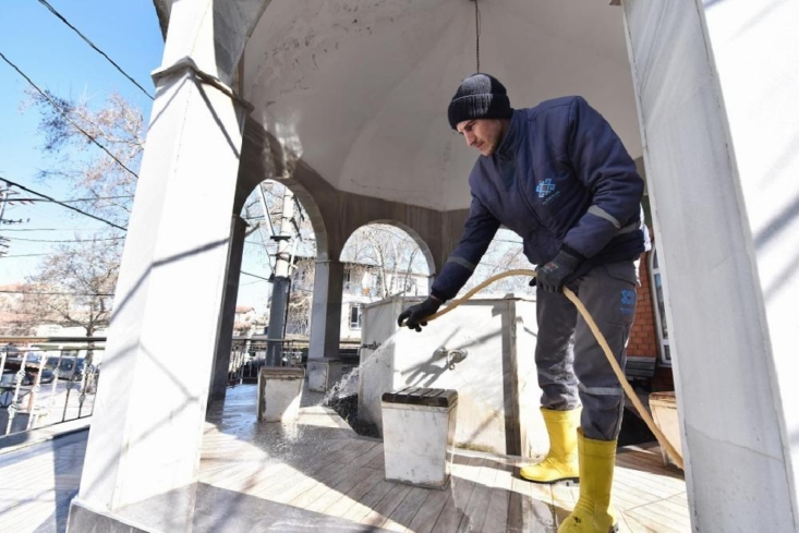 Temizlik İşleri Müdürlüğü ekipleri, camilerin duvarlarından şadırvanlara, camlardan halılara, lavabolara kadar ibadethanenin her bölgesinin temizliğini sağlıyor. Hazırlanan planlama çerçevesinde, ilçedeki tüm camilerde hummalı bir temizlik çalışması yürütülüyor.