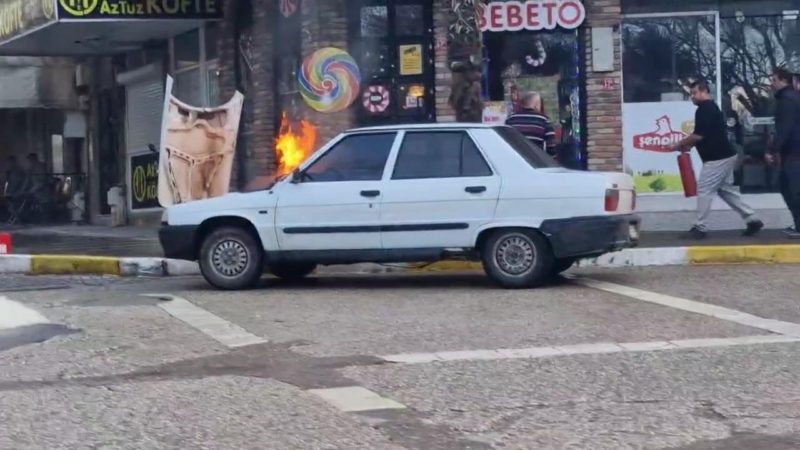 59 TF 233 aracın ön kısmından alevler yükseldiğini gören esnaf yangın tüplerini alarak araca müdahale etti.
