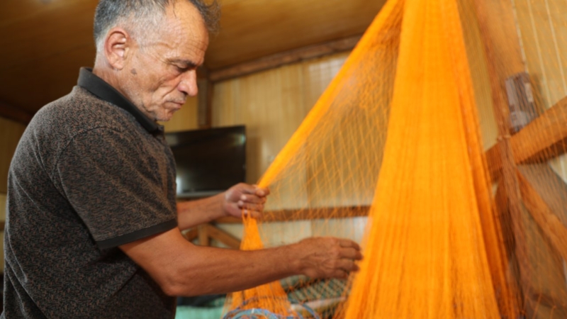 Karasu’nun Küçük Karasu Mahallesi’nde yaşayan 60 yaşındaki Sabahattin İzmit, 13 yaşında babasından devraldığı ağ tamiri mesleğini başarıyla sürdürüyor.