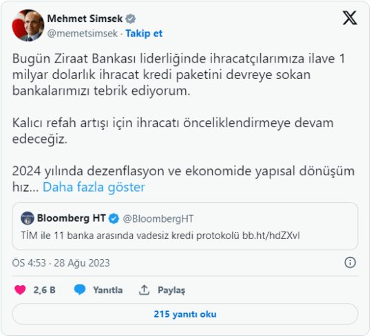 Hazine ve Maliye Bakanı Mehmet Şimşek, sosyal medya üzerinden gerçekleştirdiği açıklamada şu ifadeleri paylaştı: ”Bugün Ziraat Bankası liderliğinde ihracatçılarımıza ilave 1 milyar dolarlık ihracat kredi paketini devreye sokan bankalarımızı tebrik ediyorum.” ”Kalıcı refah artışı için ihracatı önceliklendirmeye devam edeceğiz. 2024 yılında dezenflasyon ve ekonomide yapısal dönüşüm hız kazanacak.” ”İç talebin yavaşlayacağı bir döneme gireceğiz. Firmalarımızın üzerine düşen ise ihracatı önceliklendirmek.”