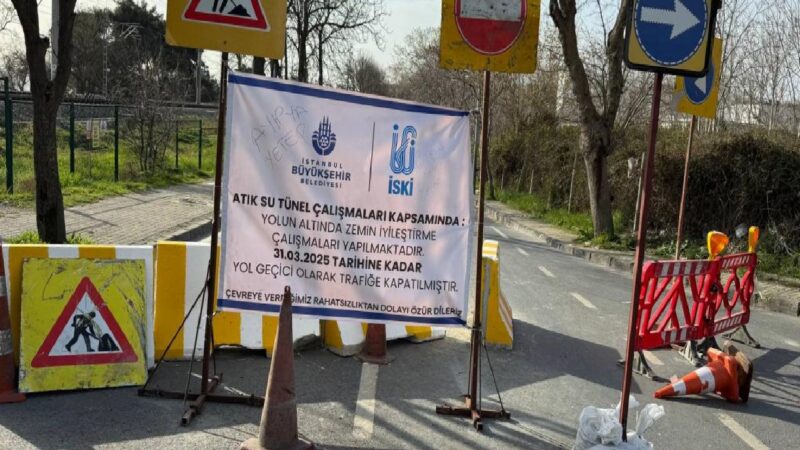 Taş blok ve demir bariyerlerle kapatılan sokağa, “Atık su tünel çalışmaları kapsamında yolun altında zemin iyileştirme çalışmaları yapılmaktadır. 31 Mart 2025 tarihine kadar yol geçici olarak trafiğe kapatılmıştır” yazılı tabela asıldı.