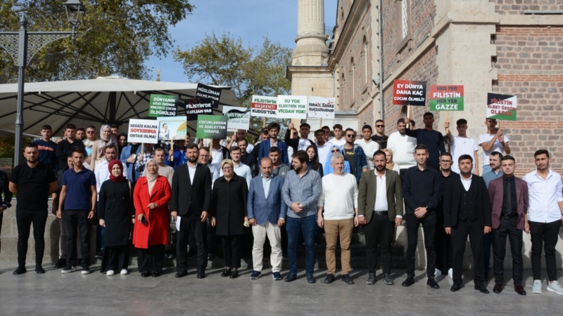 AK Parti Balıkesir İl Gençlik Kolları öncülüğünde tarihi Zağnos Paşa Camisi’nin önünde toplanan Uygur ile AK Parti İl Başkan Vekili Vahdettin Çiftçi, Karesi İlçe Başkanı Hakan Aka, İl Gençlik Kolları Başkanı Hüseyin Murat Uysal ve gençler, ellerindeki dövizlerle İsrail’i protesto etti.