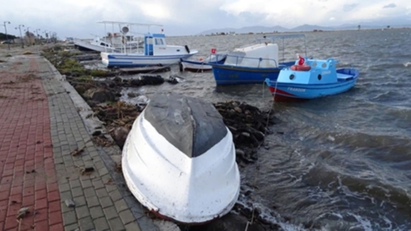 Şiddetli fırtına ve yağış nedeniyle Ayvalık’ın Aliçetinkaya Mahallesi sınırları içindeki Yunus Emre Parkı sahilinde bazı küçük balıkçı tekneleri zarar gördü.