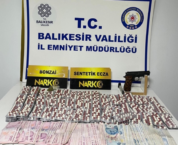 Adreste yapılan aramada 6,22 gram sentetik uyuşturucu madde, 1566 sentetik uyuşturucu hap, ruhsatsız tabanca ile uyuşturucu madde satışından temin edildiği belirlenen 33 bin 100 lira ele geçirildi