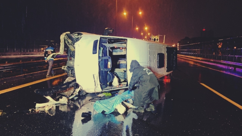 Mahmutbey Viyadüğü Ankara istikametinde seyreden N.U. idaresindeki 34 LCH 992 plakalı servis minibüsü virajı döndükten sonra bariyerlere çarparak devrildi.