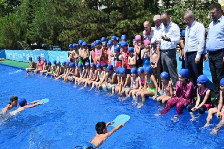 Proje kapsamında yaklaşık 5 bin çocuğun yüzme sporuyla buluşması hedeflenirken, Bursa Büyükşehir Belediye Lideri Alinur Aktaş da Yıldırım ilçesindeki Fevzi Çakmak İlköğretim Okulu bahçesine kurulan havuzda yüzme eğitimi alan çocukları ziyaret etti.