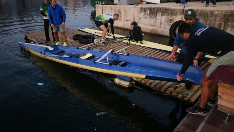 Yoğun efor isteyen kürek sporu için her sabah, gün doğmadan hazırlanan amatör sporcular, Güzelyalı Marina’dan tekneleriyle Gemlik Körfezi’ne açılıyor.