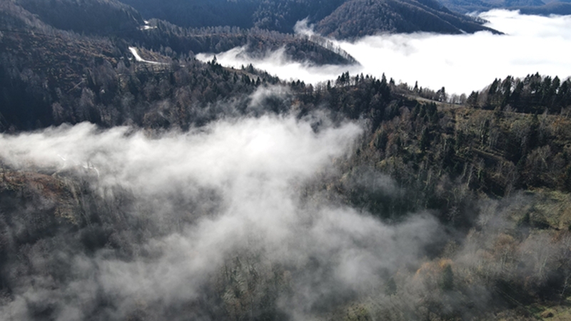 Renk cümbüşünün yaşandığı Çam Dağı’ndaki sis manzarası dronla da görüntülendi.
