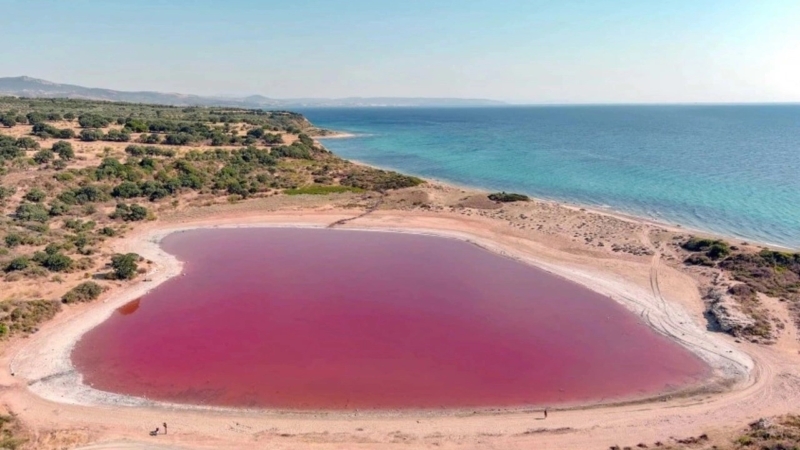 Ezine ilçesine bağlı Dalyan köyünde yer alan gizemli “Kalpli Göl,” yılın bazı günlerinde pembe renge bürünüyor ve bu doğal olay, bilim insanlarını cezbetmeye devam ediyor. Pembe Göl olarak da bilinen bu eşsiz su kütleleri, Alexandria Troas Antik Kenti’nin iç limanında bulunuyor ve 2 ila 3 metre derinliğe sahip.