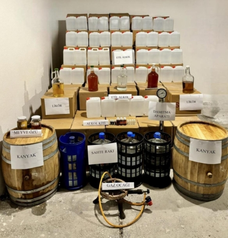 Şüphelilerin ev ve iş yerlerinde yapılan aramalarda 3 bin 317 litre etil alkol, 234 litre kanyak, 70 litre kaçak rakı, 28,5 litre meyve likörü, 14 alkol kiti ve damıtma aparatı ile sanayi tipi gaz ocağı ele geçirildi.