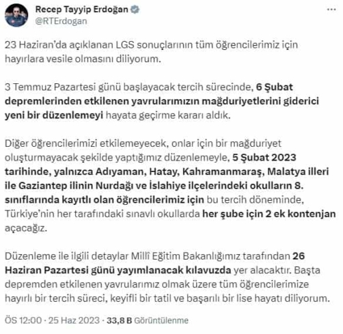 Cumhurbaşkanı Erdoğan, “23 Haziran’da açıklanan LGS sonuçlarının tüm öğrencilerimiz için hayırlara vesile olmasını diliyorum. 3 Temmuz Pazartesi günü başlayacak tercih sürecinde, 6 Şubat depremlerinden etkilenen yavrularımızın mağduriyetlerini giderici yeni bir düzenlemeyi hayata geçirme kararı aldık” dedi. Düzenlemeyle birlikte, yalnızca Adıyaman, Hatay, Kahramanmaraş, Malatya illeri ile Gaziantep ilinin Nurdağı ve İslahiye ilçelerindeki okulların 8. sınıflarında kayıtlı olan öğrenciler için Türkiye genelindeki sınavlı okullarda her sınıfta 2 ek kontenjan açılacak. Bu şekilde diğer öğrencilerin tercihlerinden etkilenmeyecek ve herhangi bir mağduriyet yaşanmayacak.