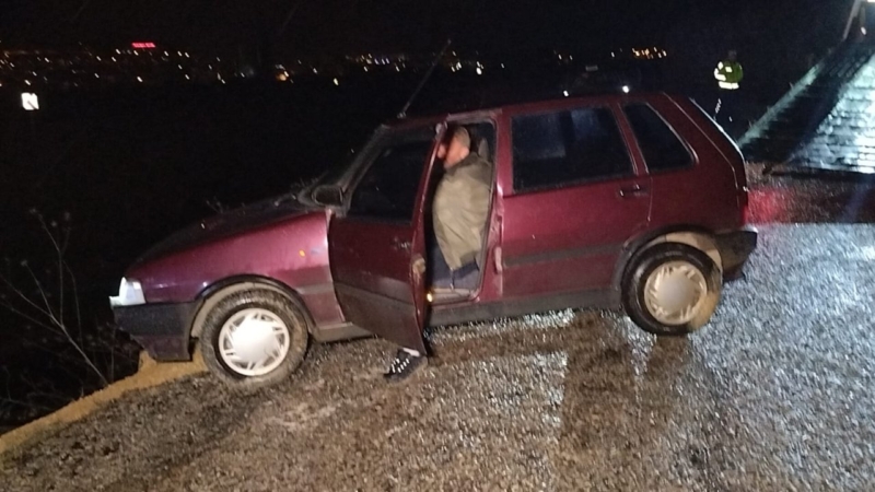 Dere yatağına doğru yoldan çıkan otomobil, yol kenarındaki ince bir ağacın gövdesine yasalanarak durabildi. Araç, su dolu dereye yuvarlanmaktan son anda kurtuldu.