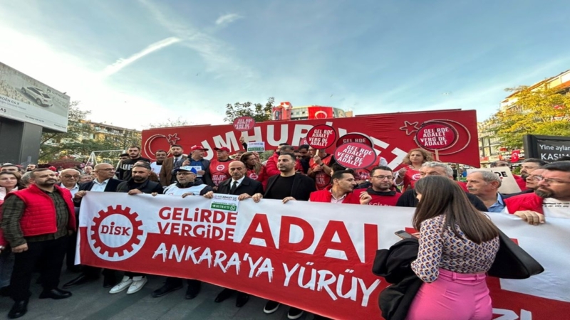 Çerkezoğlu, adil bir vergi sistemi için Ankara’ya yürüdüklerini dile getirerek, “Hükümet eğer vergi gelirini arttırmak ve daha çok vergi toplamak istiyorsa artık işçinin, emekçinin, emeklinin, halkın cebine bakmaktan vazgeçsin, kar rekorları kıran şirketlere, bankaların bilançolarına ve kur korumalı mevduatla milyonlar kazananlara baksın. Yani az kazanandan az, çok kazanandan çok vergi alınan, adil bir vergi sistemi istiyoruz. İşte bunun için İstanbul’dan Ankara’ya milyonların adalet talebini götürüyoruz.” dedi.