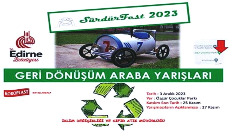 “Geri Dönüşüm Araba Yarışları için son başvuru tarihi 25 Kasım olarak belirlendi. Başvurularda tasarım yeterli olacak. Yarışmaya kabul edilen araçlar 27 Kasım tarihinde www.edirne.bel.tr internet sitesinde yayınlanacak. Tamamen geri dönüşüm malzemeleri ile tasarlanacak olan arabalarla gerçekleştirilecek yarışlarda en hızlı olup birinciliği kazanan kişi veya grup 12 bin 500 lira, ikinci 7 bin 500 lira, üçüncü de 5 bin lira ödülün sahibi olacak. En iyi tasarım yapan kişi veya grup 5 bin lira, ilk 10’a giren tasarımlar ise hediye paketi ile ödüllendirilecek.”