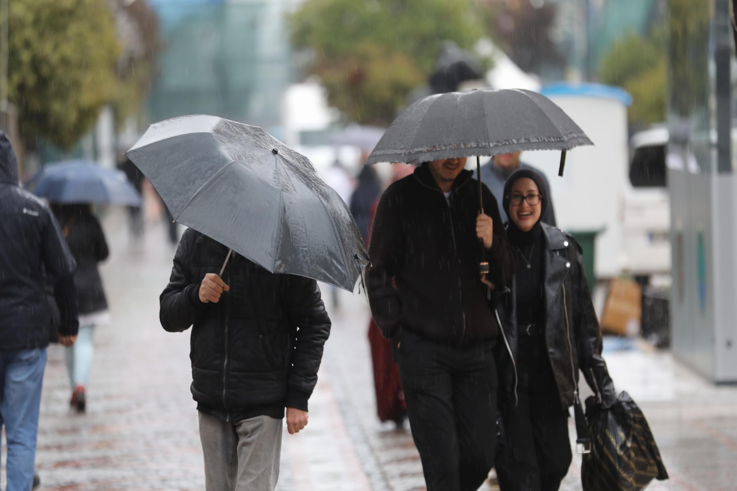 Yağışa hazırlıksız yakalanan vatandaşlar şemsiyelerle yağmurdan korunmaya çalıştı.