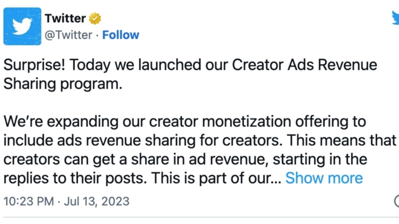 Elon Musk’ın Eylül 2022’den beri sahibi olduğu Twitter, içerik üreticilerine gelir fırsatları sunmak konusunda uzun süredir çeşitli haberler yayımlıyordu. Bu fırsatlardan en büyük olanı ise Threads’in popüler hale gelmeye başladığı günlerde duyuruldu. Twitter, içerik üreticilerinin sadece Tweet atarak para kazanabilecekleri “Creator Ads Revenue Sharing” programını duyurdu. Bu program ile elde edilen ilk gelir miktarı oldukça çarpıcı!