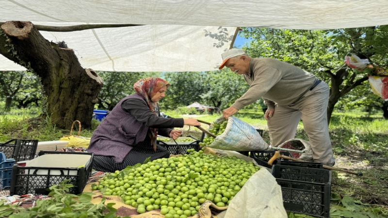 Günay, sabah 07.30’dan akşam 18.00’e kadar erik topladıklarını anlatarak, “Erik toplaması kiraza göre biraz daha kolaydır ama ağaçları büyüktür. Bazı yer ağaçları kiraz ağaçlarından da büyüktür. Herkes erik toplayamaz. Merdivene çıkıp topluyoruz. Zordur biraz, yorucudur.” diye konuştu.