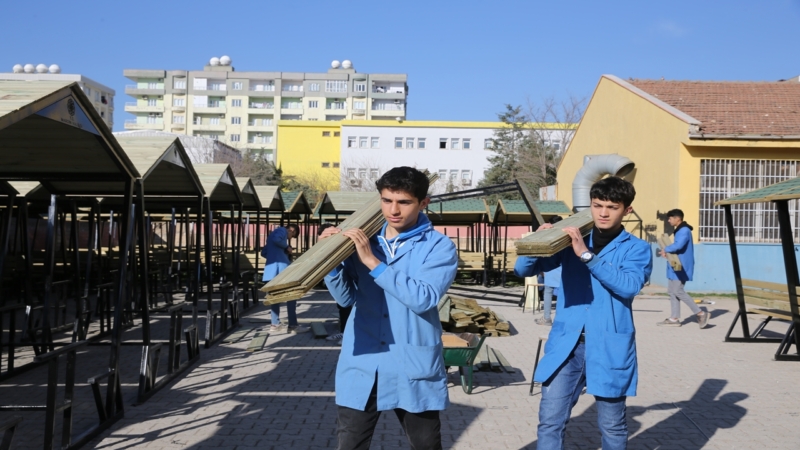Mardin’in Kızıltepe ilçesinde Mimar Sinan Mesleki ve Teknik Anadolu Lisesinde okuyan öğrenciler, okullara sıra, masa ve dolap, il genelindeki park ve bahçelere de oturma bankı, çardak, kameriye, çöp kovası üreterek hem mesleki tecrübe kazandı hem de lisenin gelirini artırdı.