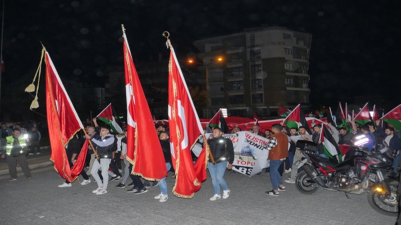 Türkiye ve Filistin bayraklarının yanı sıra ellerinde dövizler taşıyan çok sayıda vatandaş, Şehit Hamdi Bey Meydanı’nda toplandı.