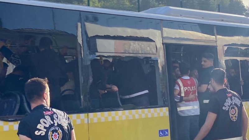 RAMS Park’a gelen siyah beyazlı taraftarları taşıyan otobüse taş atan sarı kırmızılı taraftarlar ile Beşiktaşlılar arasında kısa sürede arbede çıktı. Polis kalabalığı güçlükle ayırırken otobüslerin camlarının kırık olduğu dikkatlerden kaçmadı.