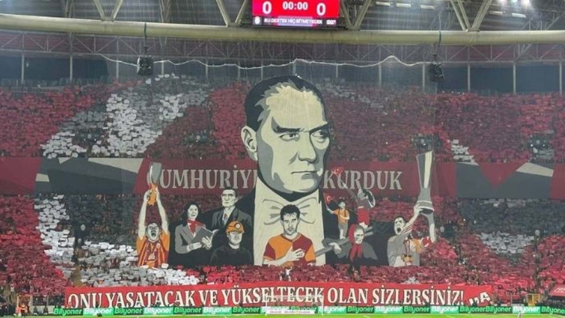 Galatasaraylı taraftarlardan Beşiktaş derbisi öncesinde Cumhuriyet’in 100. yılına özel olarak hazırlanan kareografi sergilendi. Tüylerin diken diken olduğu anlarda “Cumhuriyet’i biz kurduk, onu yaşatacak ve yüceltecek olan sizlersiniz” sözüne yer verildi.