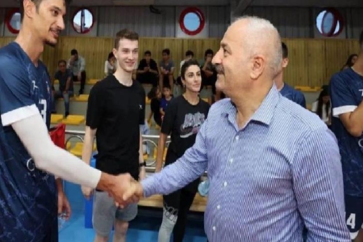 Gebze Kapalı Spor Salonunda düzenlenen karşılaşma öncesi atletlerle bir ortaya gelen Gebze Belediye Lideri Zinnur Büyükgöz, muvaffakiyet temennilerini illetti.