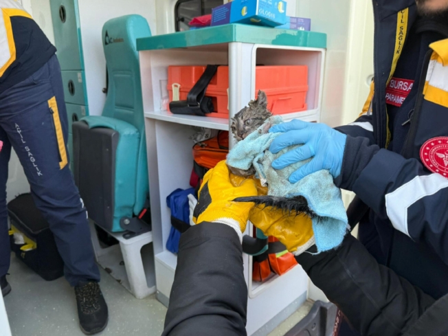 Maske takılarak oksijen verilen kedi yavrusu, sağlık ekiplerinin ilk müdahalesinin ardından Bursa Büyükşehir Belediyesi Sokak Hayvanları Tedavi Merkezi yetkililerine teslim edildi.