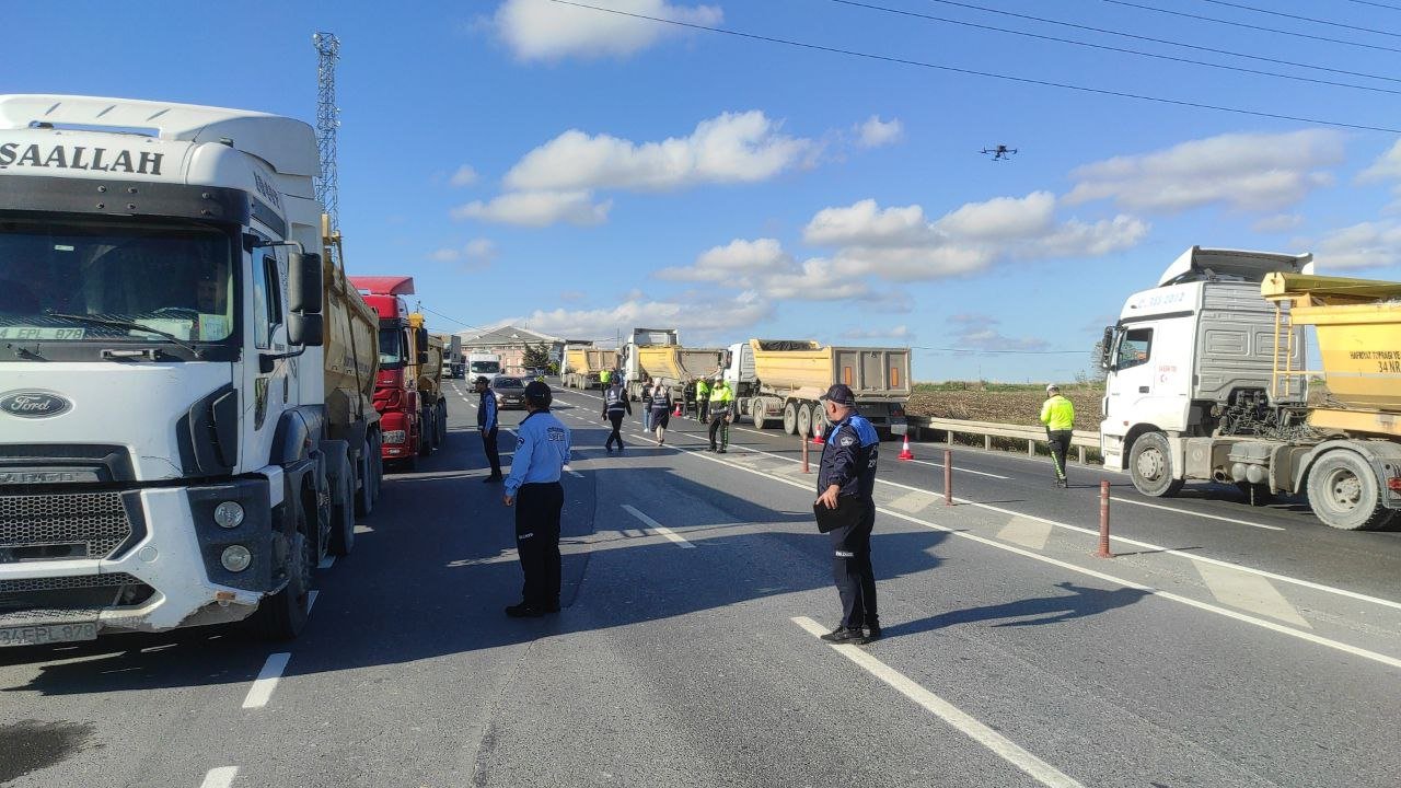 Arnavutköy’de gerçekleştirilen hafriyat kamyonları denetimlerinde, Haraçcı-Hadımköy Yolu Caddesi’nde İstanbul Büyükşehir Belediyesi (İBB) ekipleri, polis ve zabıtanın bir araya gelerek oluşturduğu denetim noktasında, kurallara uymayan sürücülere cezalar verildi.