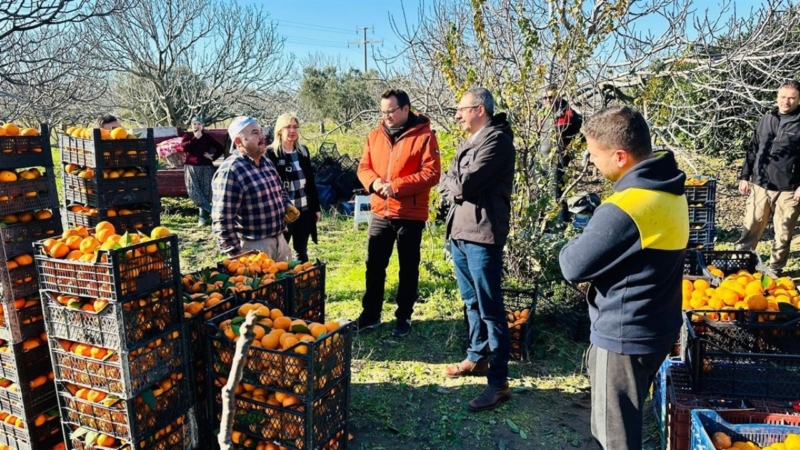 Özderin ve Altay, İlçe Tarım ve Orman Müdürü Mehmet Emre Çakan’la mandalina tarlasını ziyaret ederek, hasada katıldı.