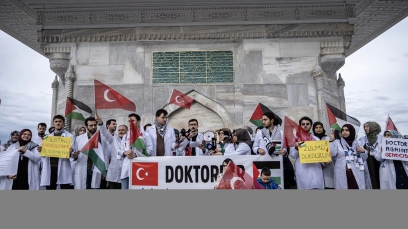 Üsküdar’daki III. Ahmet Çeşmesi önünde bir araya gelen çeşitli branşlardan 100’e yakın hekim, İsrail’in Filistin’e yönelik saldırılarını protesto etti. Ellerinde “zulmü durdurun” ve “Filistinli kardeşlerimi öldürmeyin” yazılı dövizlerle Türk ve Filistin bayrakları taşıyan hekimler, “Doktorlar Filistin’e Destek Oluyor” yazılı pankart açtı.