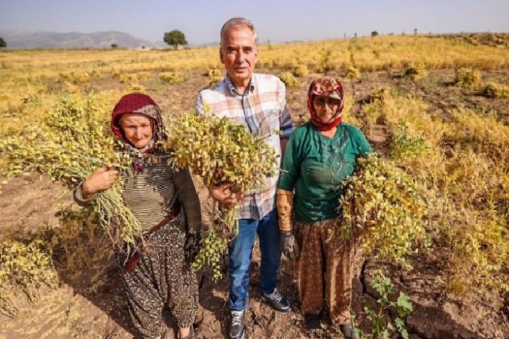 DENİZLİ (İGFA) – Denizli Büyükşehir Belediyesinin tohum desteklemeleriyle, 17 ilçede 700 çiftçinin 7.600 dekar alanda toprakla buluşturduğu toplam 94 ton nohut, hasat edilmeye başlandı. Denizli Büyükşehir Belediye Lideri Osman Zolan bu kapsamda takviye verdikleri nohut tohumlarını tarlalarına eken Tavaslı çiftçilerin hasadına katıldı. Lider Zolan’a Tarım ve Orman Vilayet Müdürü Şakir Çınar, Büyükşehir Belediyesi Genel Sekreter Yardımcısı Ömer Faruk Özer ve beraberindekiler eşlik etti. Tavas ilçesinin Çiftlikköy Mahallesi’nde Hüseyin Arzuman’ın tarlasını ziyaret eden Lider Zolan, burada nohut hasadı yapan bayanlara kolaylıklar diledi. Hemşehrileriyle sohbet eden Lider Zolan, daha sonra eldiven giyip bayanlarla birlikte bir müddet nohut yoldu. Çiftçilerle hasat rahmetinin memnunluğunu yaşayan Lider Osman Zolan, küçükken köyde nohut yolduğu günleri anımsayarak çocukluğunu tekrar yaşadığını söyledi.