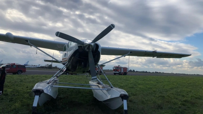 Toprak alana saplanan uçaktaki iki pilot, kazadan yara almadan kurtulurken havalimanı bir süre uçuş trafiğine kapatıldı.