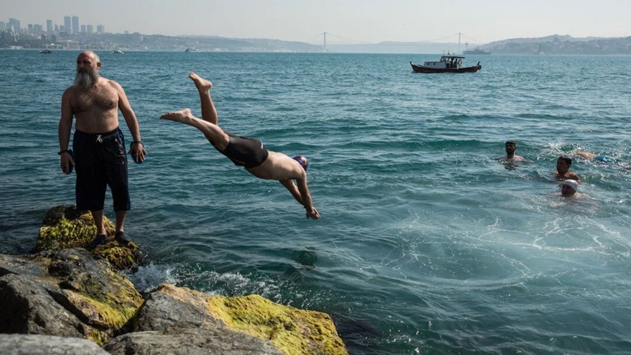 Gruptakiler, Gazze’de hayatını kaybedenler için dua ettikten sonra sırayla suya atlayarak kulaç attı.