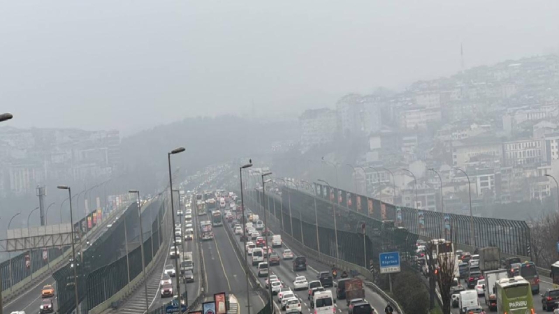 Sis farlarını açan araçlar, köprüdeki yoğun trafikte kontrollü ilerledi.