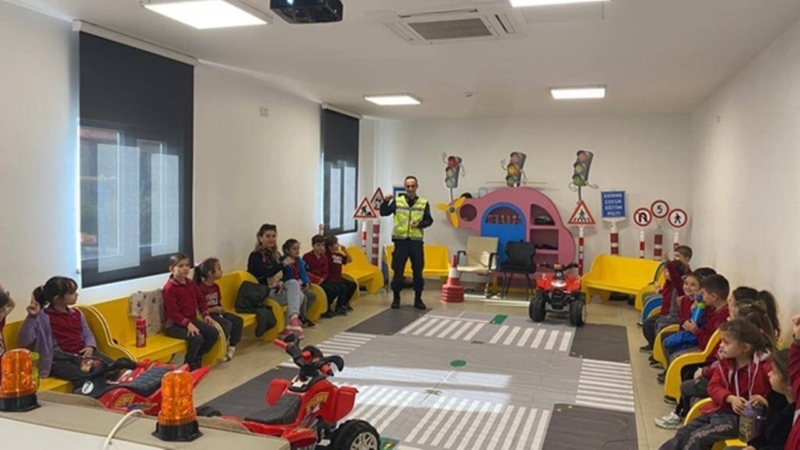 Öğrencilere temel trafik kuralları hakkında eğitim verildi, trafik jandarmasının kullandığı araç ve gereçler tanıtıldı.