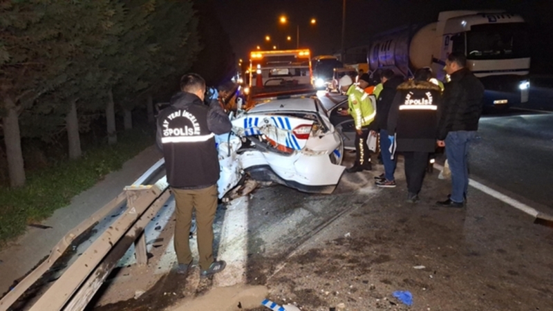 İçerisinde 14 düzensiz göçmenin bulunduğu hafif ticari araç, otoyolun Körfez geçişi gişeler mevkisinde 2 polis aracına çarptı.