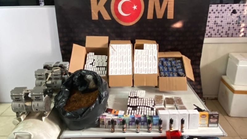 Aramalarda 47 bin 400 makaron, 12,5 kilogram kıyılmış tütün, 7 kilogram nargile tütünü, hava kompresörü ve tütün sarma makinesi ele geçirildi.