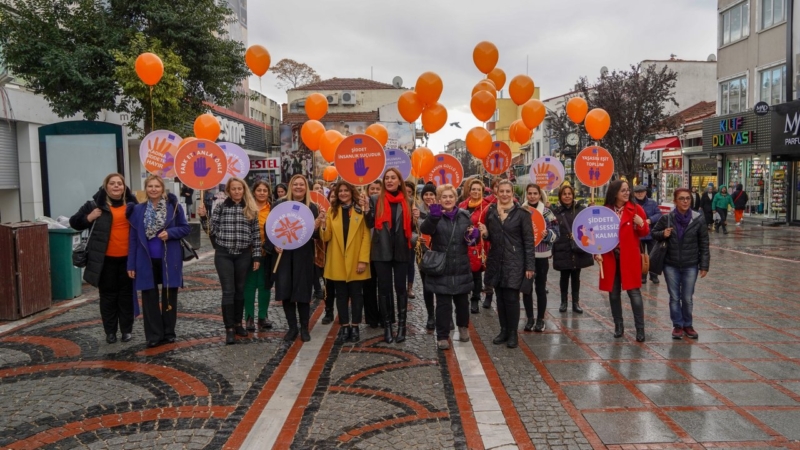 Saraçlar Caddesi’nde toplanan grup “Kadınlar birlikte güçlü”, “Şiddete sessiz kalma”, “Güçlü kadın güçlü yarın” yazılı dövizlerle ve turuncu balonlarla Atatürk Anıtı’na yürüdü.