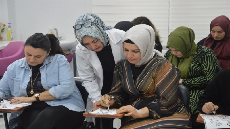 Adapazarı Halk Eğitim Merkezi’nde 244 saatlik kursa katılan 20 kadın, el ve bileklere Hint kınasıyla geleneksel motifler çizmeyi öğreniyor.