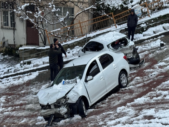 Kağıthane'de karla kaplı yokuştan inerken kayan otomobil, park halindeki araca çarparak hasara neden oldu.