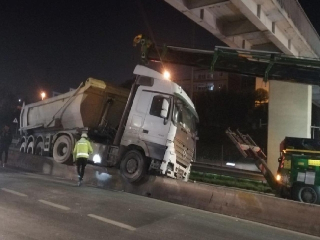 Hasdal-Okmeydanı bağlantı yolunda seyreden hafriyat kamyonu, sürücüsünün kontrolünden çıkarak, yolun orta bölümündeki beton bariyerlerin üzerinde asılı kaldı.