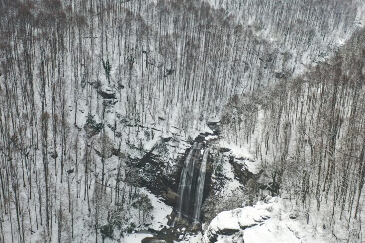 Kar örtüsünün arasından süzülen Suuçtu Şelalesi ve çevresi dronla görüntülendi.