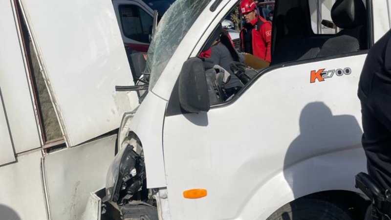 Sürücünün araçta sıkışarak yaralandığı kaza yerine sağlık, polis ve itfaiye ekipleri sevk edildi.