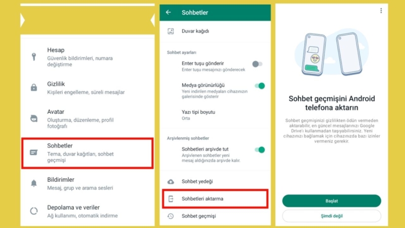 - Eski telefonunuzdaki WhatsApp uygulamasında bulunan Ayarlar bölümüne girin ve “sohbetler” sekmesini açın.