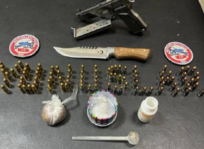 Ekipler, 1 ruhsatsız tabanca, şarjör, 82 fişek, 1 kasatura, 110 gram sentetik uyuşturucu ele geçirdi.