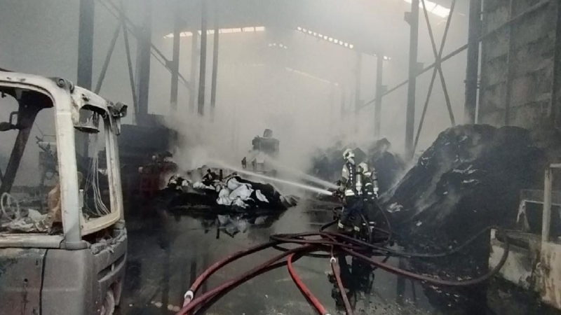 Hasar oluşan fabrikada soğutma çalışması yapılıyor.
