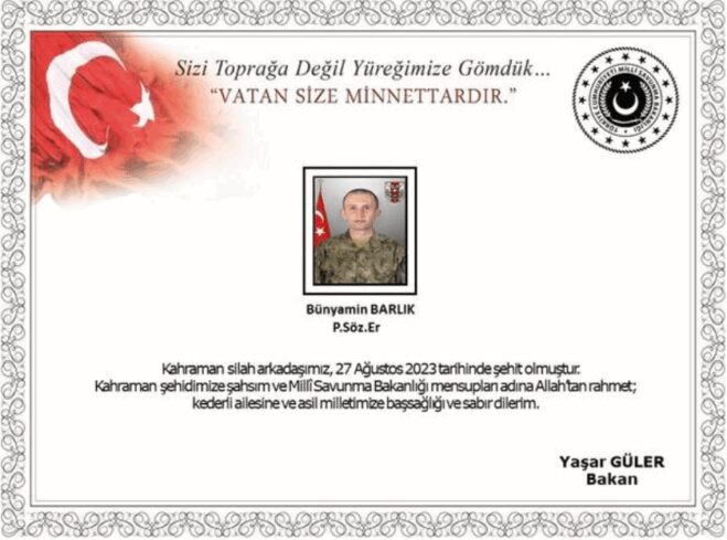 Bakanlıktan gerçekleşen paylaşımda, “Pençe-Kilit Operasyonu bölgesinde, 27 Ağustos 2023 tarihinde kahraman silah arkadaşımız Piyade Sözleşmeli Er Bünyamin Barlık, arazide kayarak düşmesi sonucu şehit olmuştur. Bizleri derin bir acı ve üzüntüye boğan bu olayda, hayatını kaybeden aziz şehidimize Allah’tan rahmet, kederli ailesine, Türk Silahlı Kuvvetleri ile asil milletimize başsağlığı ve sabır dileriz” ifadeleri kullanıldı.